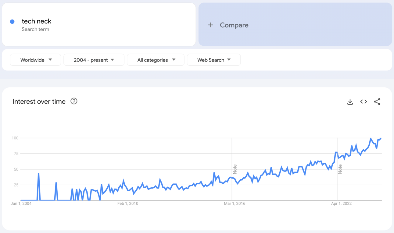 So it turns out hunching over a laptop for 50 hours a week is terrible for your back. Who knew? This has led to many of us suffer with an affliction known as “tech neck“. Tech neck is basically neck or shoulder pain, soreness or stiffness caused by poor posture while using technology. And there’s been an explosion in searches for this problem in recent times, meaning there’s businesses to be built here.