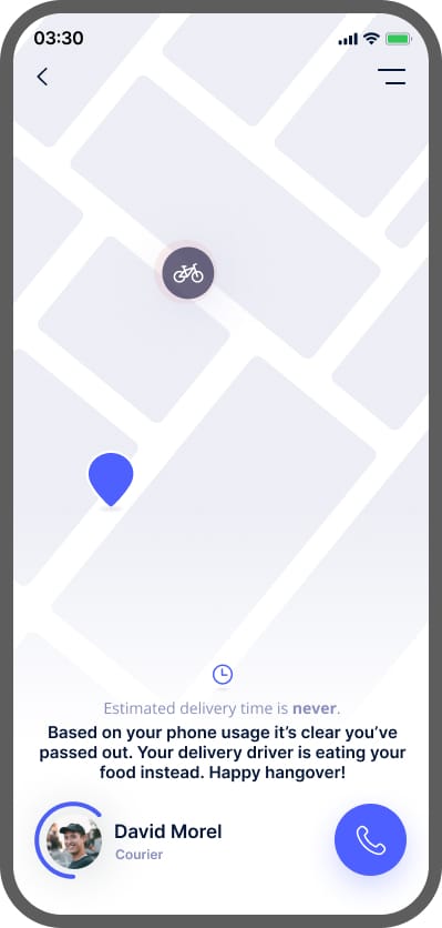 Our new food delivery app can detect when a user is drunk based on the time of day and how they use the app, meaning the food doesn’t go to waste and the delivery driver is happy too