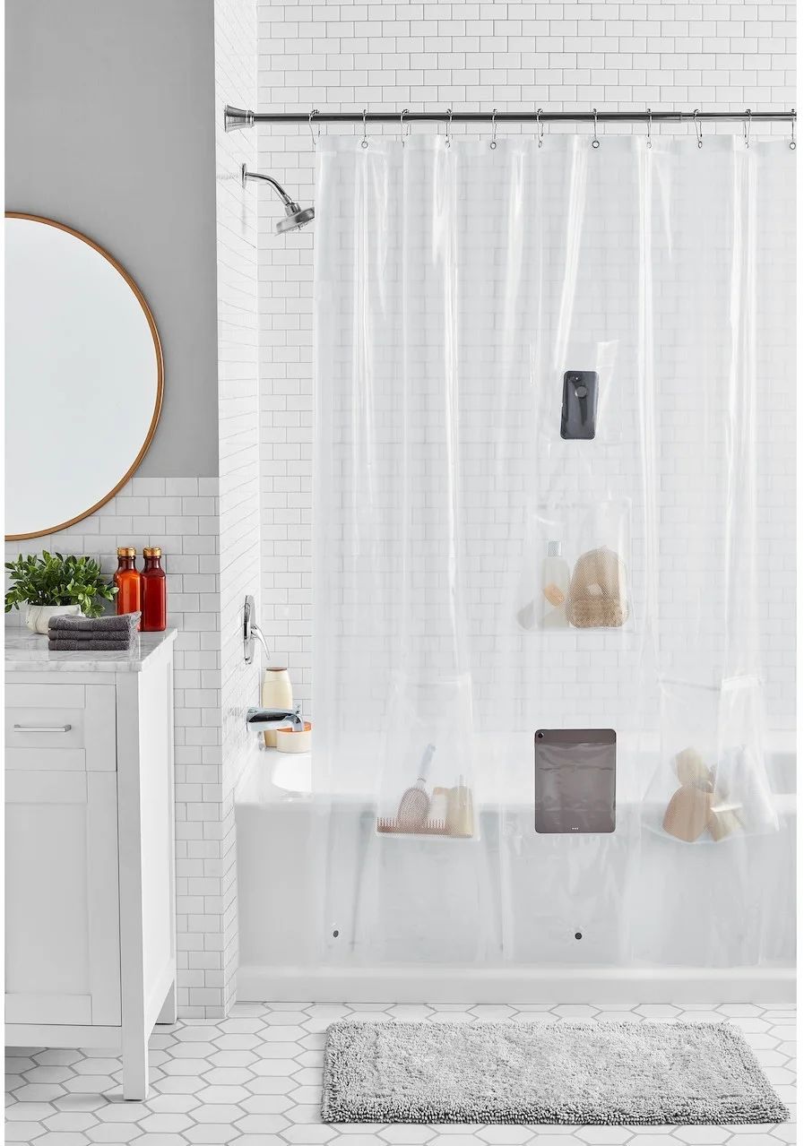 Introducing the Splash Stasher™, the only shower curtain with built-in pockets, because why shouldn't your shower be as organized as your sock drawer?