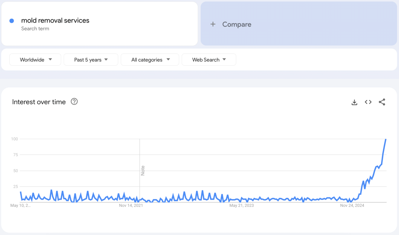 Search traffic for “mold removal services” has exploded in recent weeks, just after we shared a mold removal startup idea back in edition #279. Coincidence? We think…yeah probably.
