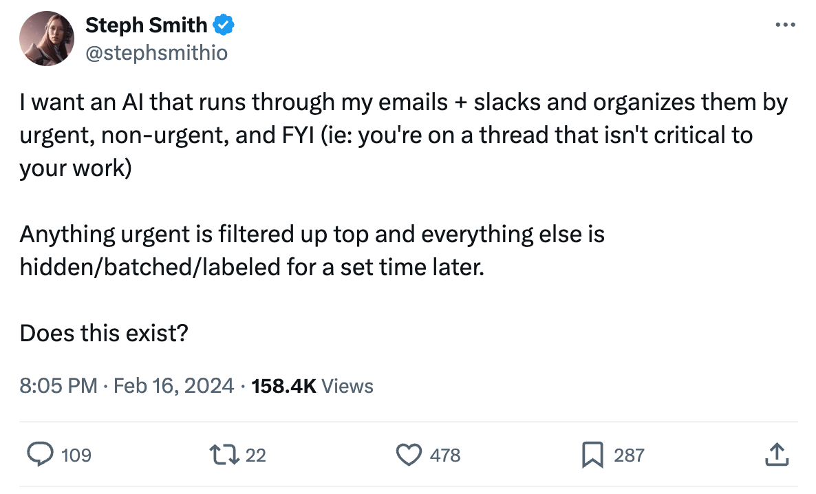💡 TLDR: an AI which goes through emails, slacks, teams chat etc. and organizes messages, updates and tasks in order of importance.