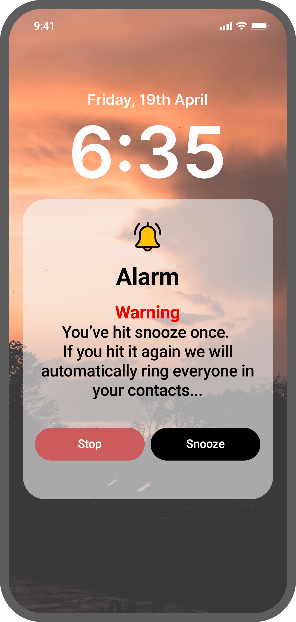 Well not anymore with AccountabilityAlarm. AccountabilityAlarm will ring everyone in your contacts if you hit the snooze button more than once.
