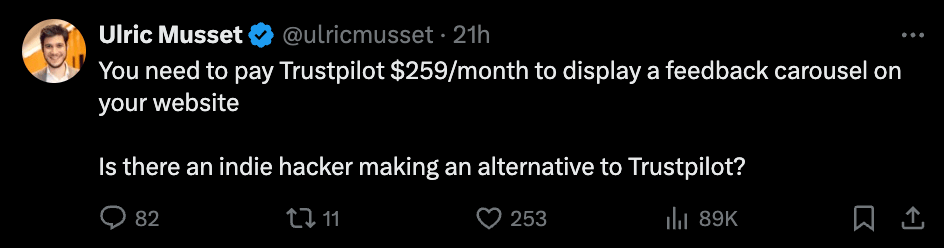 Ulric Musset is out here looking for an alternative to Trustpilot, surely someone can help him out?