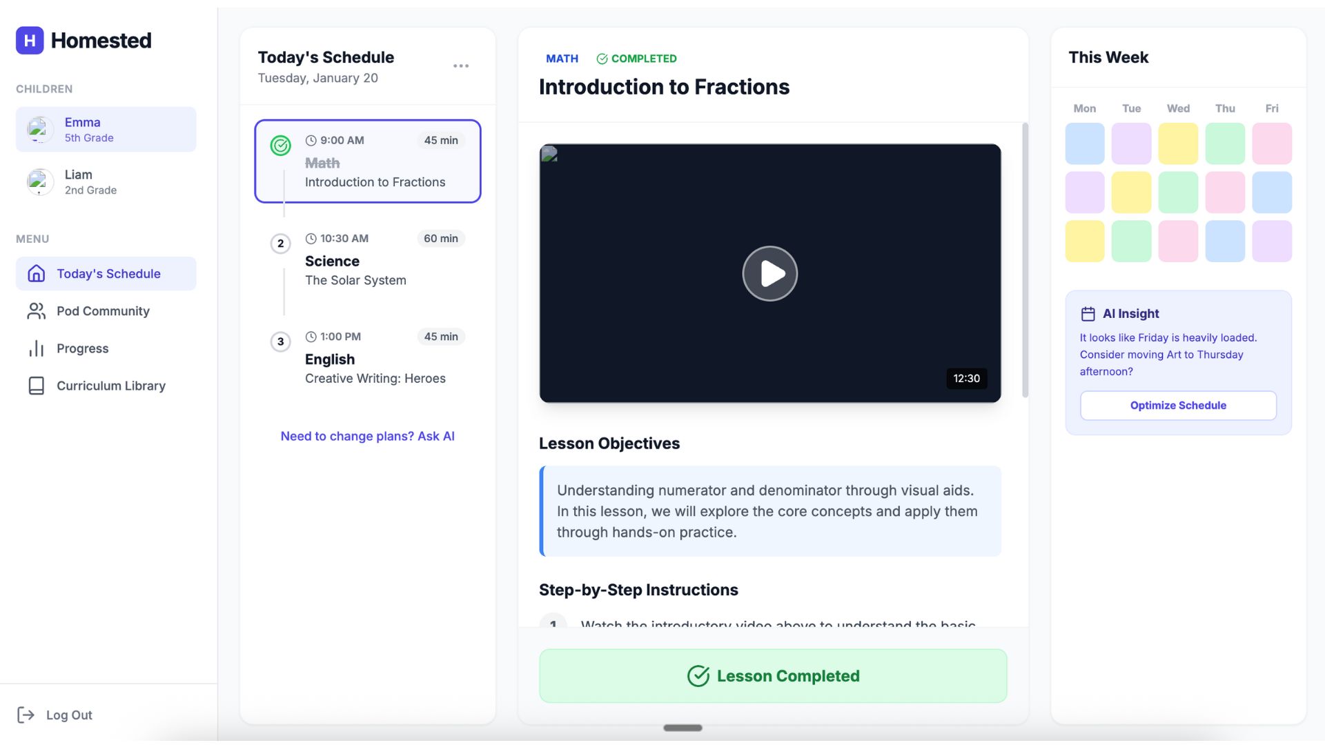 Each day, parents get a simple dashboard showing exactly what to teach, with lesson materials, videos, and activities ready to go. The AI tracks progress, flags gaps, and suggests adjustments - like a co-teacher who actually knows what they're doing.