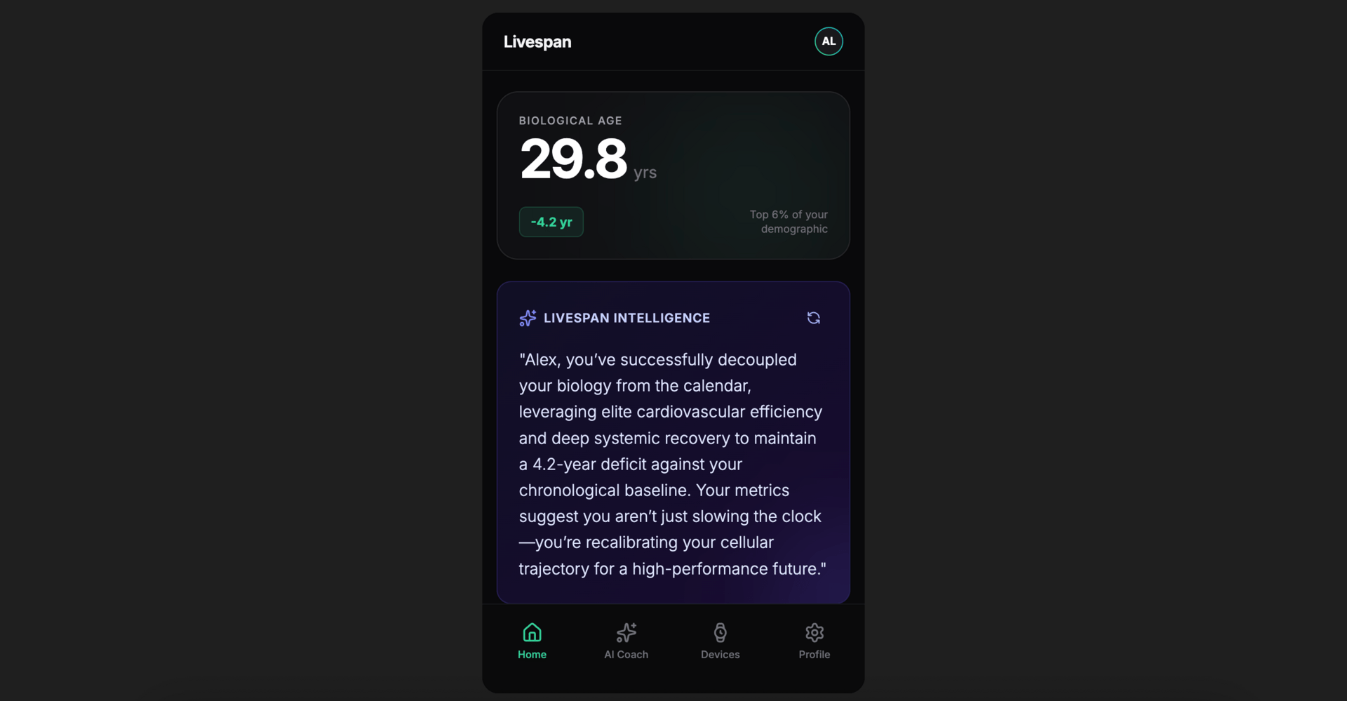 An algorithm analyzes your aggregated data against longevity research to calculate your biological age and shows you exactly which habits are adding or subtracting years.