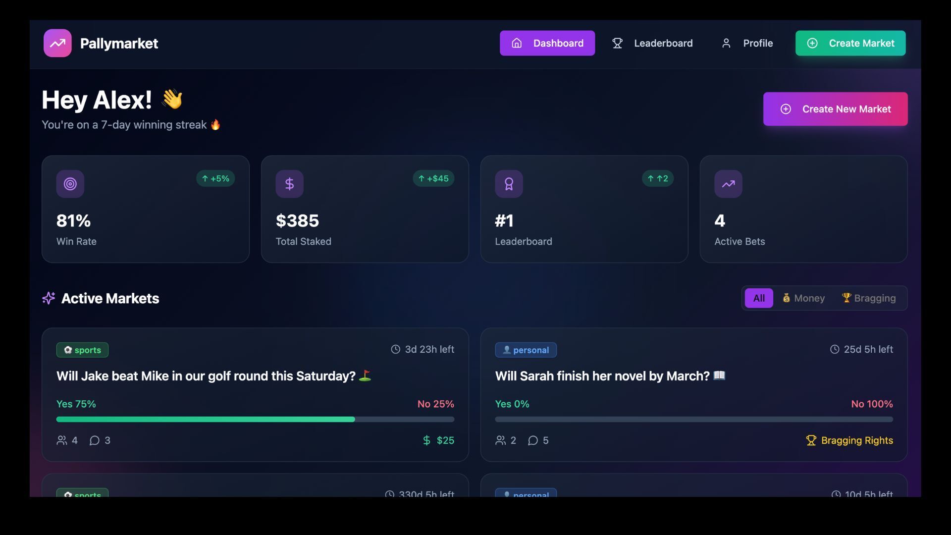💡 The Idea: A private prediction market platform where friend groups can create, bet on, and settle custom markets on literally anything.