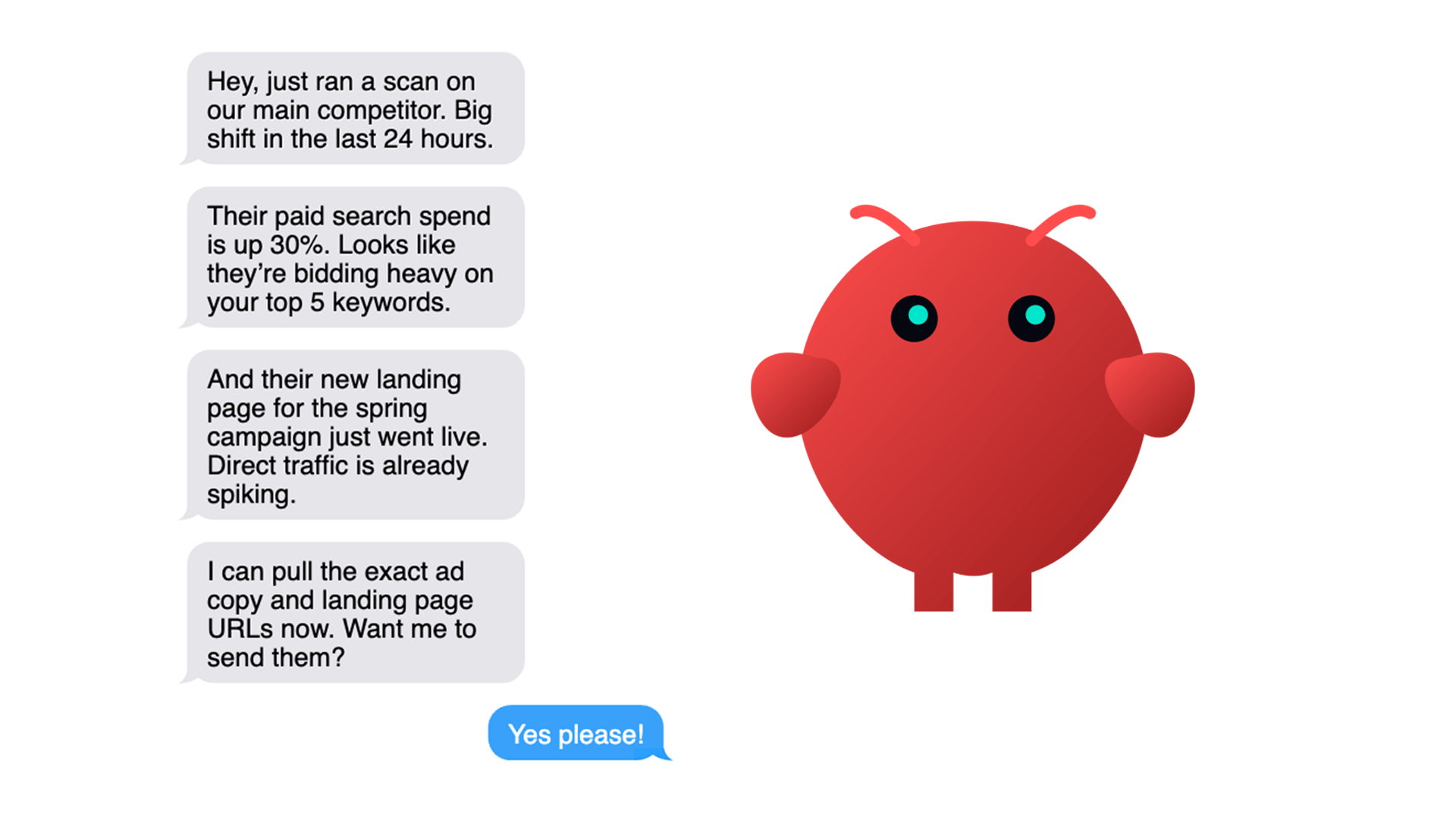 Every morning at 8am you get a WhatsApp message with the highlights, for example: “Competitor X raised prices 20%. Competitor Y launched a feature you’ve had on your roadmap for 6 months.”