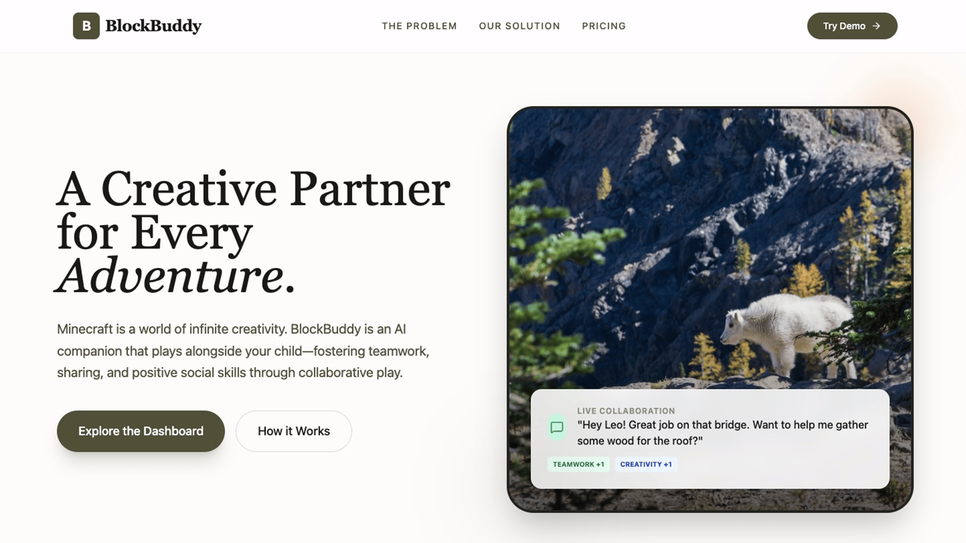 Parents set up a companion profile with age, interests, and values, the AI joins your kid's Minecraft world as a friendly player who builds, explores, and chats naturally within the game.