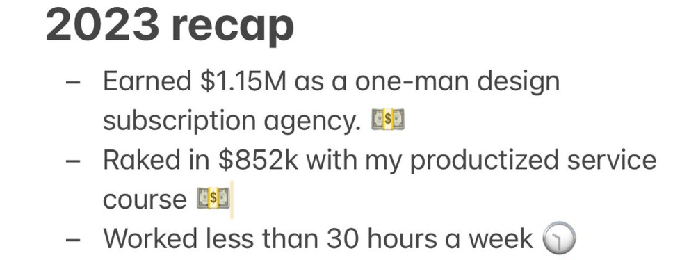 Let’s take the story of Brett Williams. Brett runs his own 1 man design subscription agency and here’s part of his 2023 recap:
