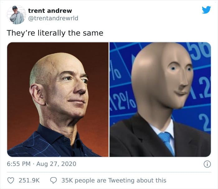 From their core e-commerce business to building AWS, Prime Video and countless other products Amazon dominates in almost any market they participate in. Jeff Bezos has made so much money that he literally looks exactly like the stonks guy.