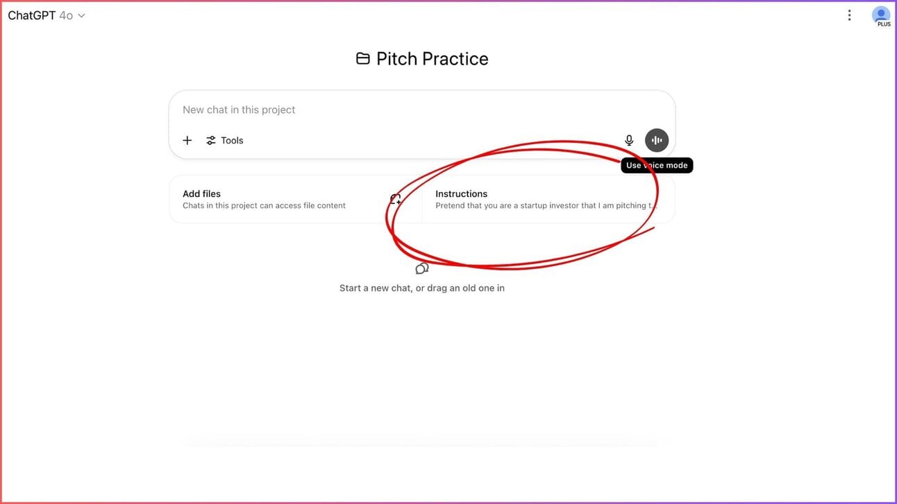 Open up ChatGPT and start a new project called “Pitch Practice”