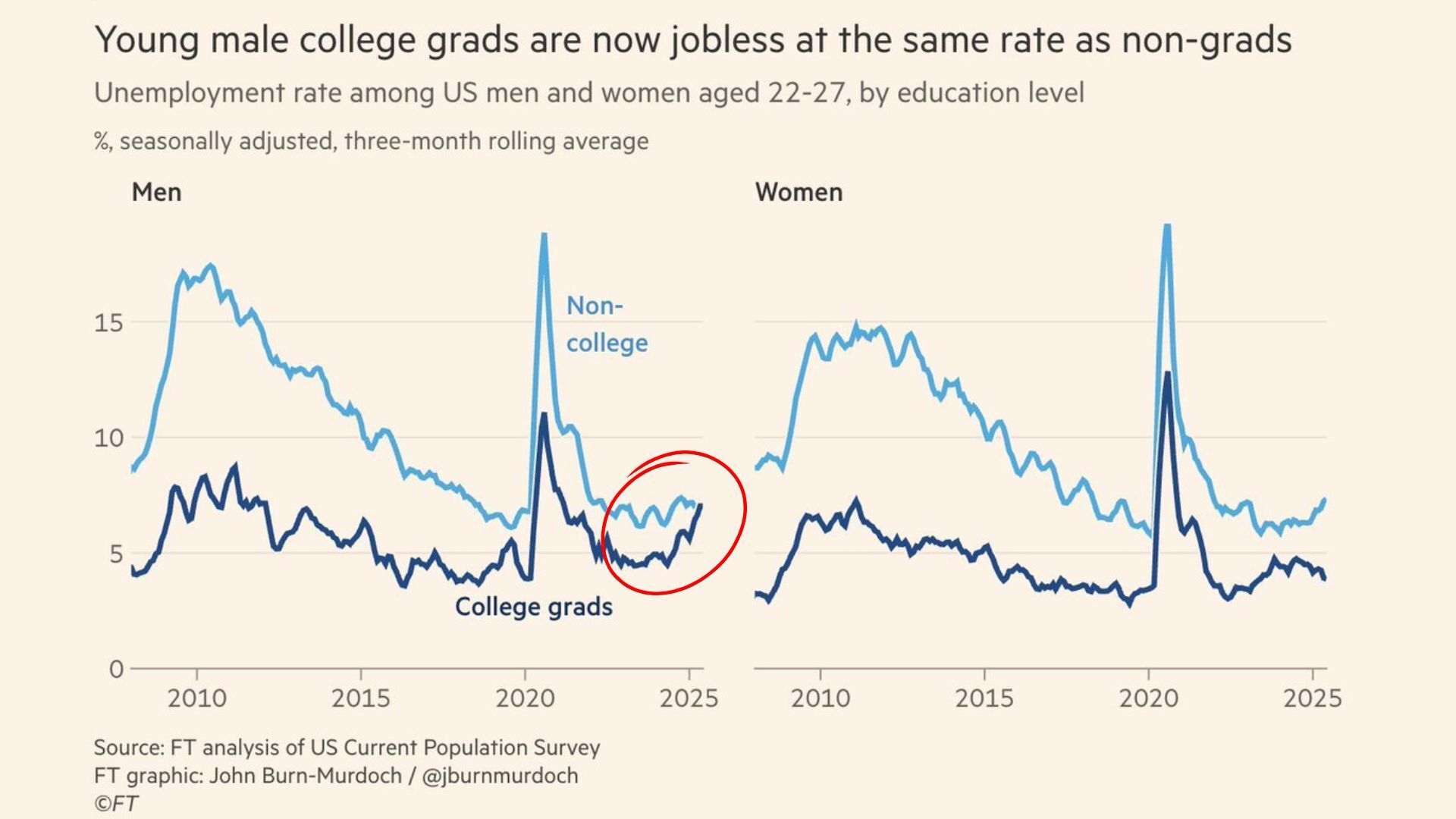 The Trend: The college advantage is fading, especially for men, suggesting that a degree is no longer a guaranteed ticket to job security. Recent data shows that for the first time young male college graduates in the US (ages 22–27) are now facing the same unemployment rates as their non-college-educated peers, a sharp reversal from historical norms. And given the crazy of college these days, this makes the calculus on deciding to go about as difficult as the actual calculus math undergrads are studying. Yikes.