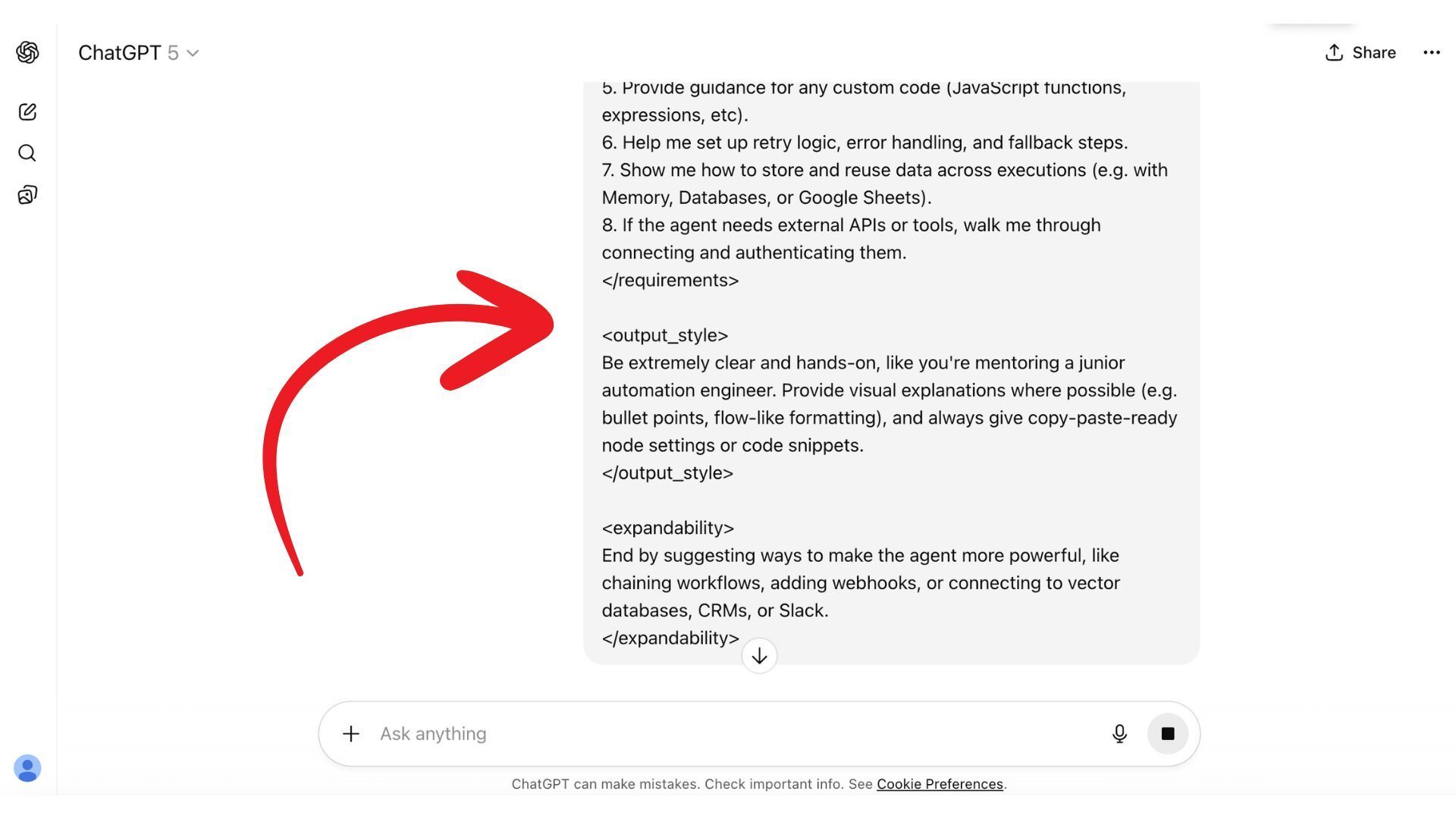Chat GPT will return the n8n nodes, triggers, error handling etc.
