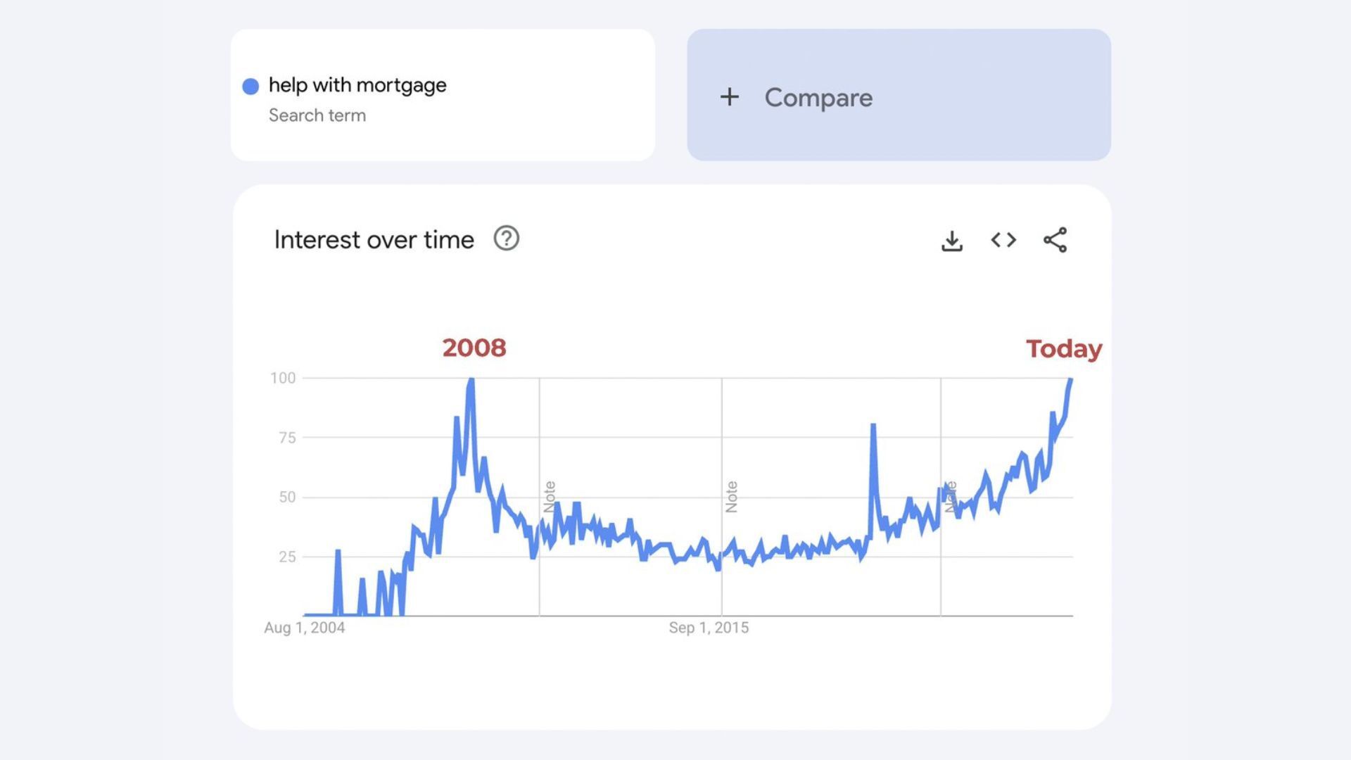 The Trend: Everyone's celebrating the "soft landing" and saying the economy is fine. But Google Trends is telling a slightly different story. Searches for "help with mortgage" have spiked back to 2008 levels, the same peak we saw during the financial crisis. High interest rates, inflated home prices, and economic uncertainty are creating a perfect storm here. Let’s hope today’s 25 basis point rate cut will help, but let’s be honest…we’ll need a few more cuts to make that happen.