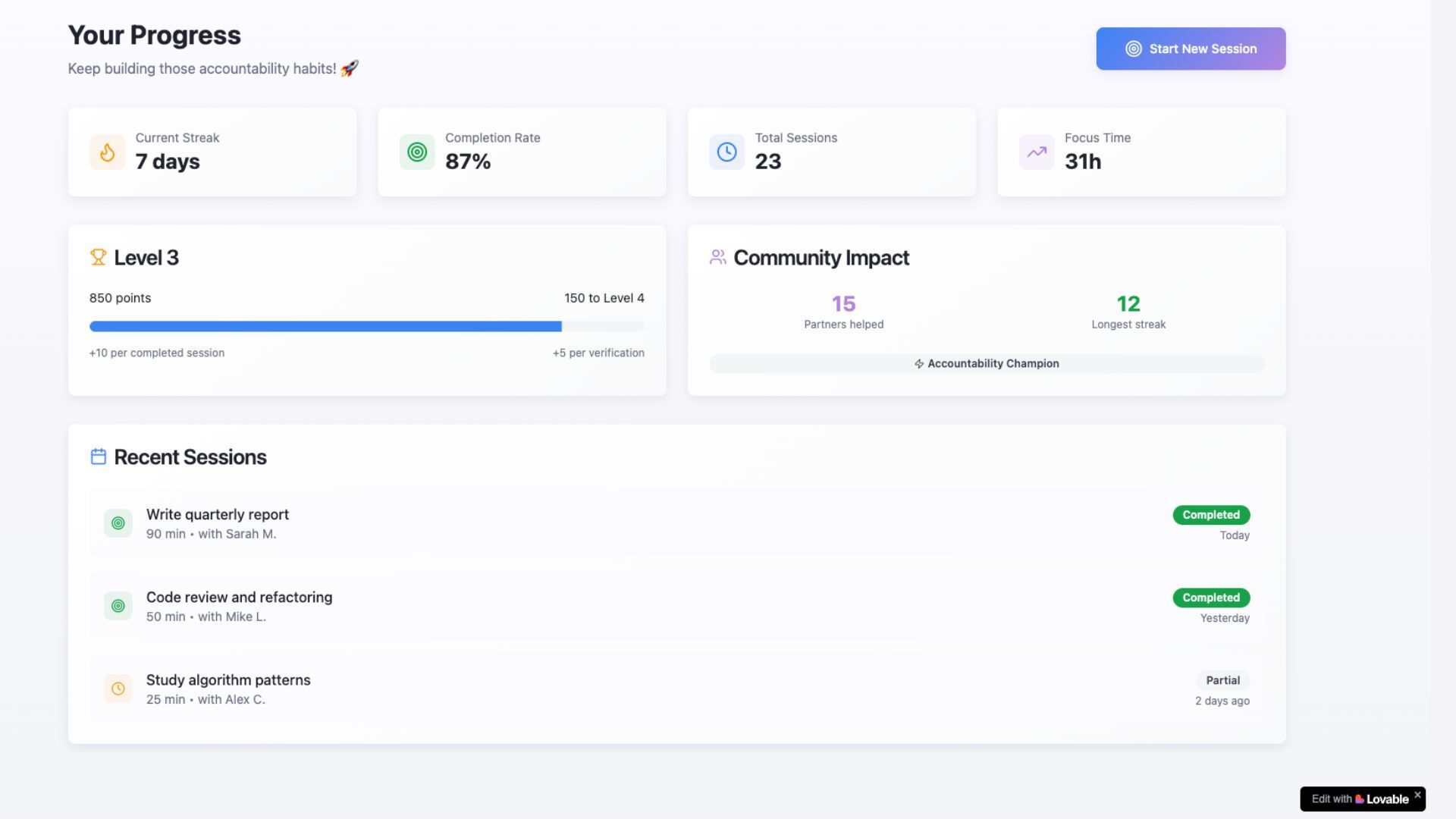 ✅ End-of-session check-in: quick proof (text/photo/checkbox), mutual verification, streaks, and a credit system that you earn for completion and lose for flaking.