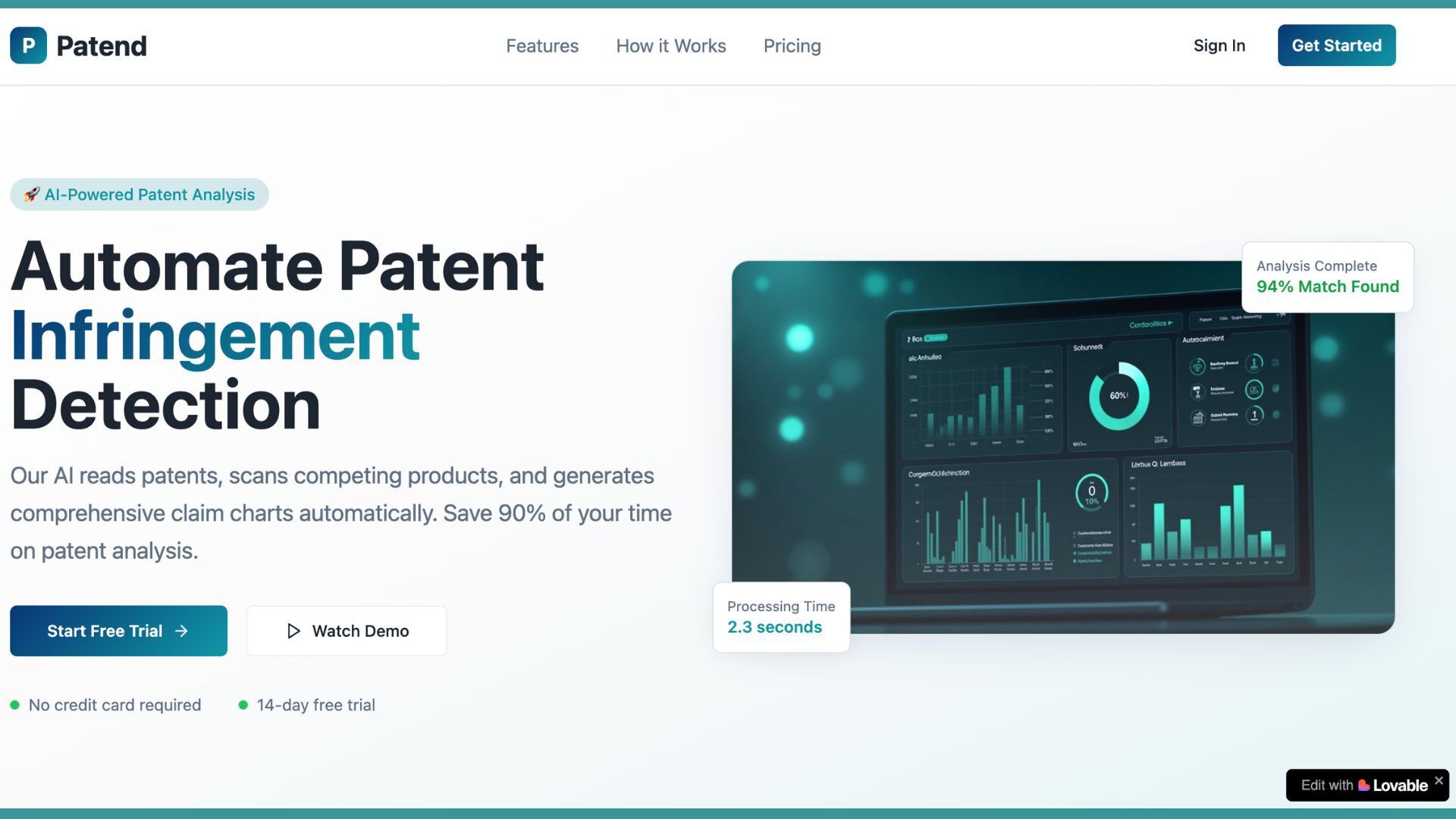 A legal or IP team in a company sign up and upload their patents. AI then identifies key technical features and scrapes competitor product data and compares to check for any patent infringement.