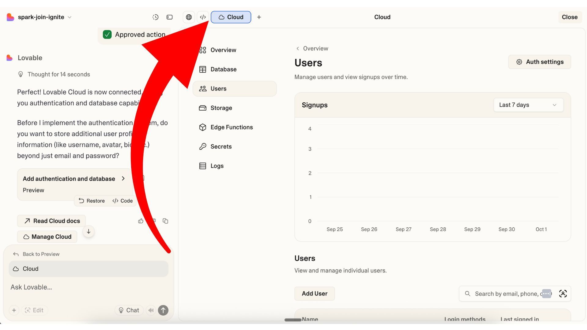 Click the cloud icon in the menu bar and enable Lovable Cloud.
