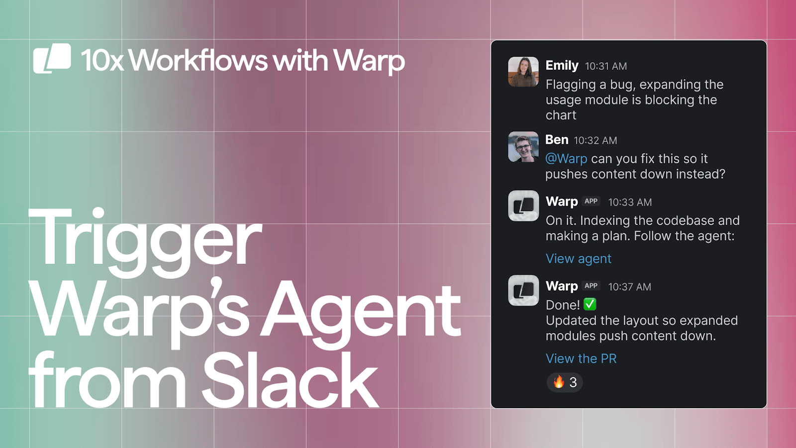 Technical founders wear every hat — engineer, PM, designer — and all the small product bugs and improvements pile up fast. Now you can tag @warp on any Slack thread or Linear ticket, just like you would a teammate, and Warp will pick up the task.