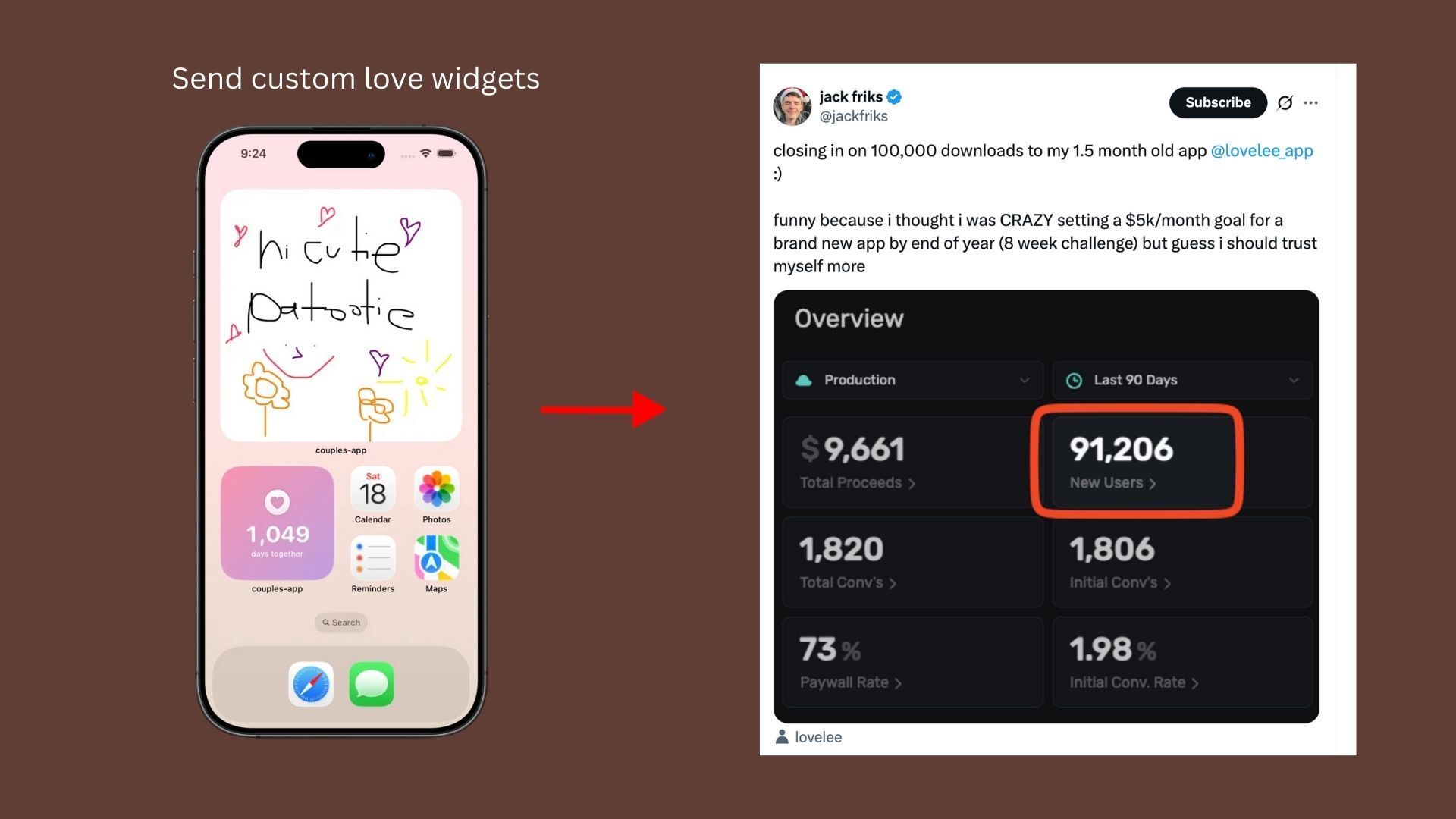The Guide: Jack Fricks is a legend in the indie hacker community. And recently he launched a mobile app called lovelee that allows couples to send widgets to each other. The app is 1.5 months old and is about to pass 100,000 downloads, all by driving free traffic from TikTok and Instagram. Here’s his strategy.