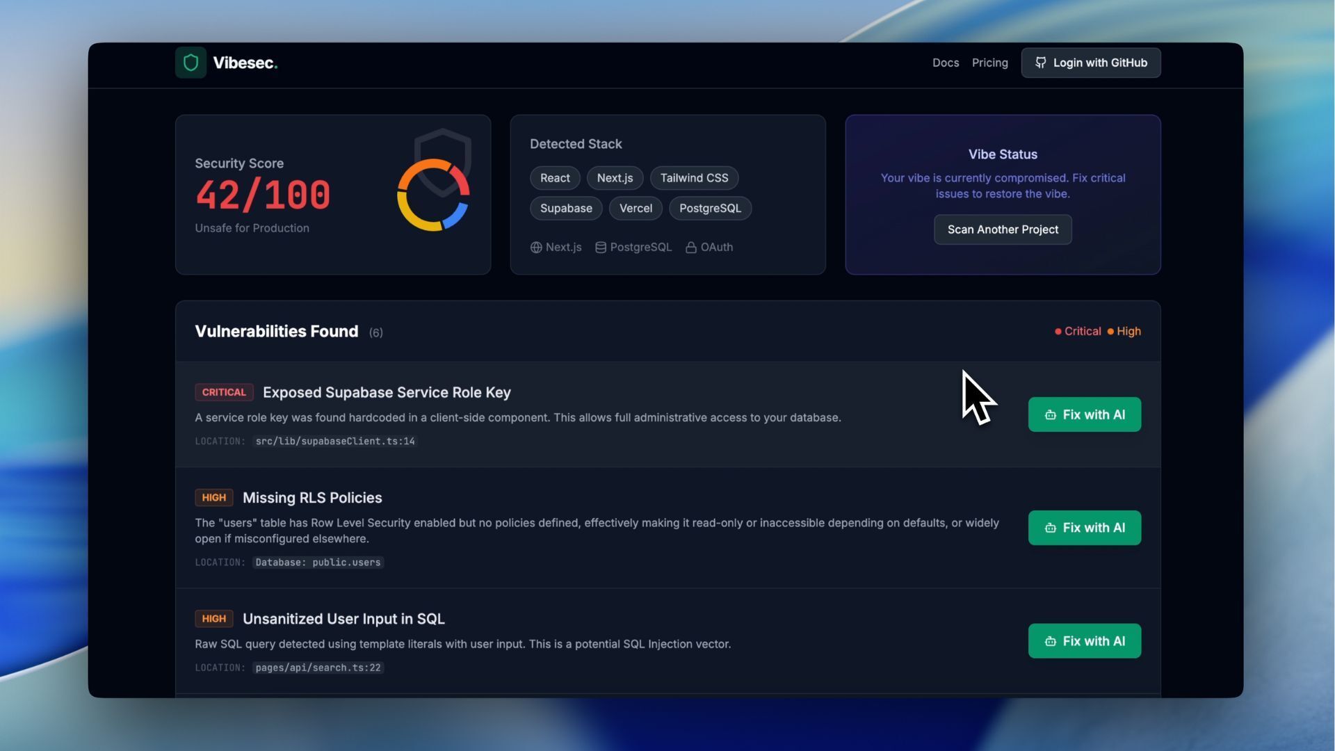 Sign up with GitHub, connect your Cursor/Bolt project or paste a live URL, and the platform automatically detects your tech stack (React, Next.js, Supabase, Firebase, etc.) and initiates a comprehensive security scan within seconds.